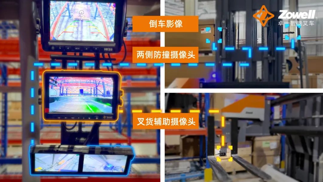 03、配置倒车影像及两侧防撞摄像头,消除视线盲区,有效减少碰撞事故发生率。在货叉处安装无线摄像头,实时画面清晰可见,辅助驾驶员调整货叉位置,不需要像传统叉车一样靠驾驶员肉眼判断的熟练度来提高叉货精准度,提高货物堆叠精准度和安全性。