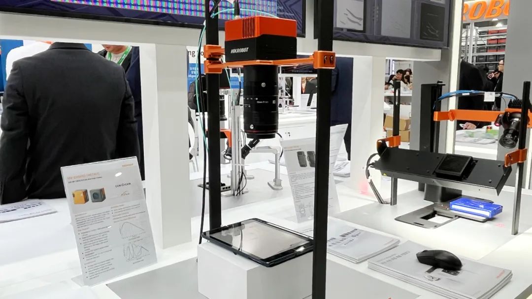 该展台展示了海康机器人DP系列3D激光轮廓传感器,配合VM3D算法对锂电池进行焊缝缺陷检测、顶盖平整度检测、密封钉缺陷检测的场景,具有高精度、高速率的优势。