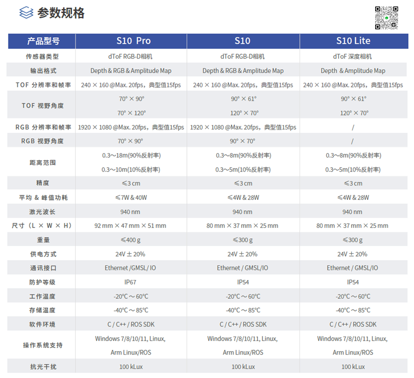 S10采用dToF高精度固态激光雷达技术,通过测量光脉冲的飞行时间来计算物体距离,实现高精度、高分辨率的深度感知。相较于iToF方案,dToF在远距离避障和抗强光干扰等方面具有显著优势,即使在室外强光照环境下也能稳定工作。
