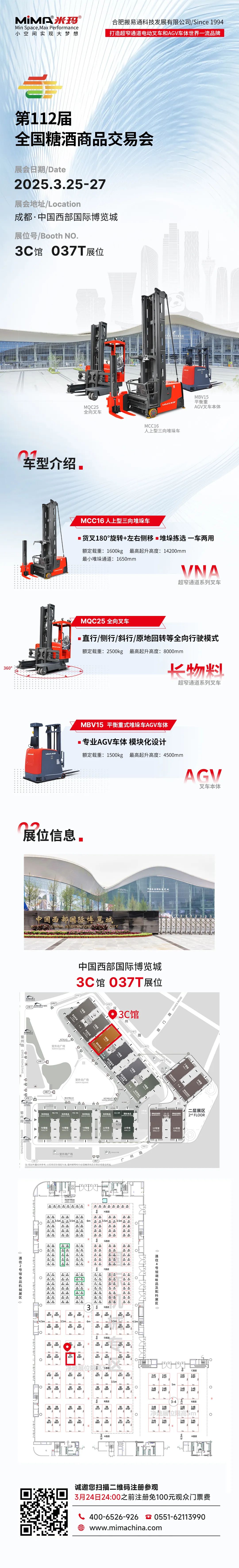 合肥搬易通(MiMA米玛)专注叉车领域研发制造已三十余年,始终致力于“打造超窄通道电动叉车和AGV车体世界一流品牌”。本次糖酒会,我们将携带多款超窄通电动叉车系列及AGV叉车本体系列产品亮相,旨在展示最优质的产品和最高效的物料搬运解决方案!