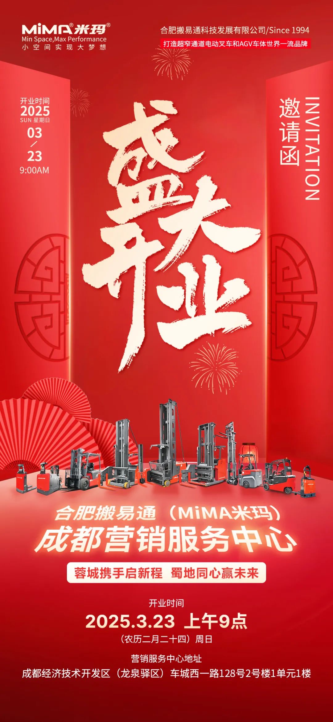 合肥搬易通(MiMA米玛)诚挚地邀请您于3月25日-27日莅临成都·中国西部国际博览城3C馆037T展位,亲身感受MiMA米玛电动叉车的魅力,与我们的专业团队深入交流,了解如何通过我们的产品优化物料搬运流程,助力企业提升效率与竞争力!