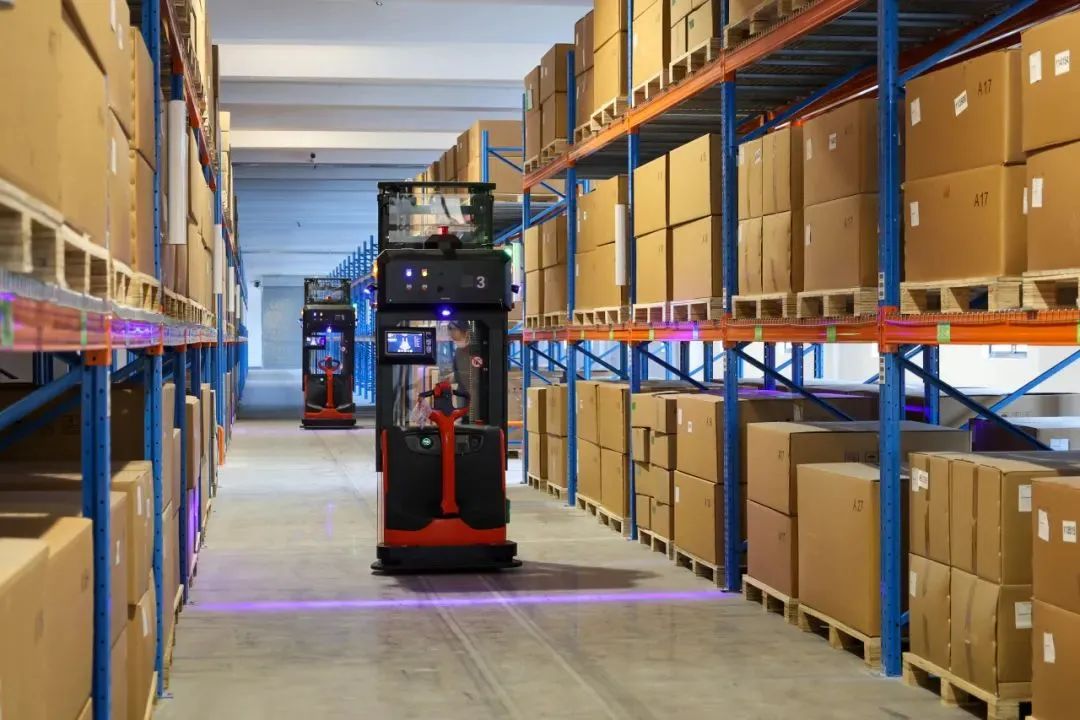 AGV叉车来到打包好的产品前,对产品进行扫码识别后,搬起了一米见方的包装箱,有序放入仓库货架。