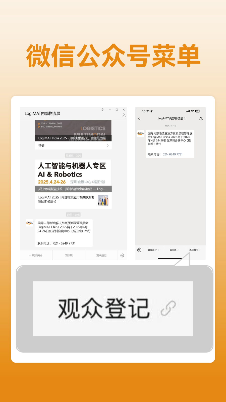 方式一:微信公众号 长按下方图片识别二维码,关注展会官方公众号:LogiMAT内部物流展(ID:logimat-china),点击菜单栏【观众登记】,即可进入预登记页面。