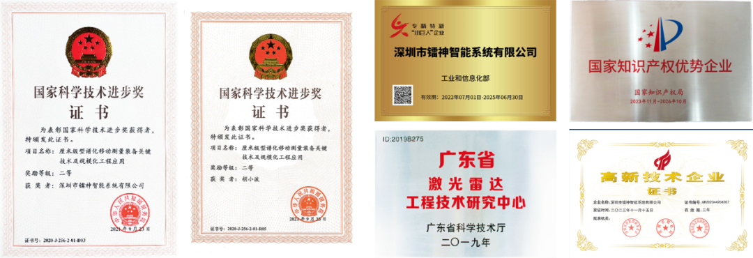 镭神智能凭借雄厚实力和优秀业绩,得到了国家及地方政府部门的一致认可:荣获 2020 年国家科 技进步二等奖;成功入选“国家工信部新一代人工智能产业创新重点任务优胜揭榜单位”;获广东省科 技厅认定为“广东省激光雷达工程技术研究中心”; 实力斩获 2019 广东省重点领域研发计划“新能 源汽车”重大科技专项;成功入选国家级专精特新“小巨人”企业。