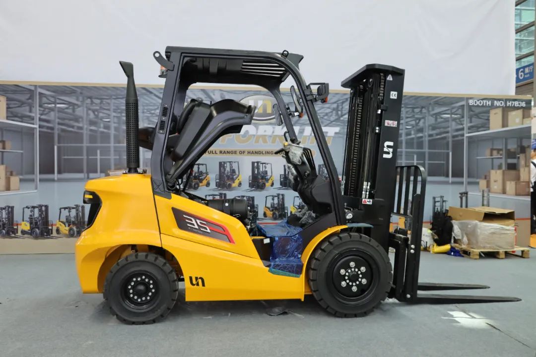 尤恩推出的F系列3.5吨柴油叉车,在动力性能、安全性和人机工程学方面全面升级,适用于高强度物流作业环境。
