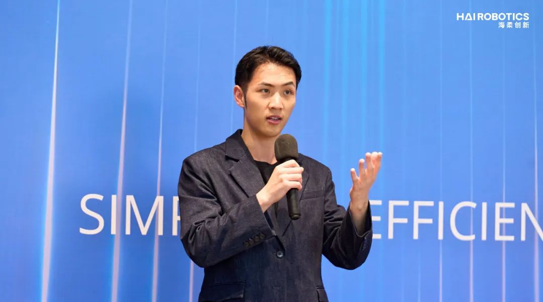 峰会现场,海柔创新闪攀系统产品专家Boris Feng通过沉浸式场景演示,展示了闪攀系统如何简单、高效地完成高坪效、高效率的仓储运营。