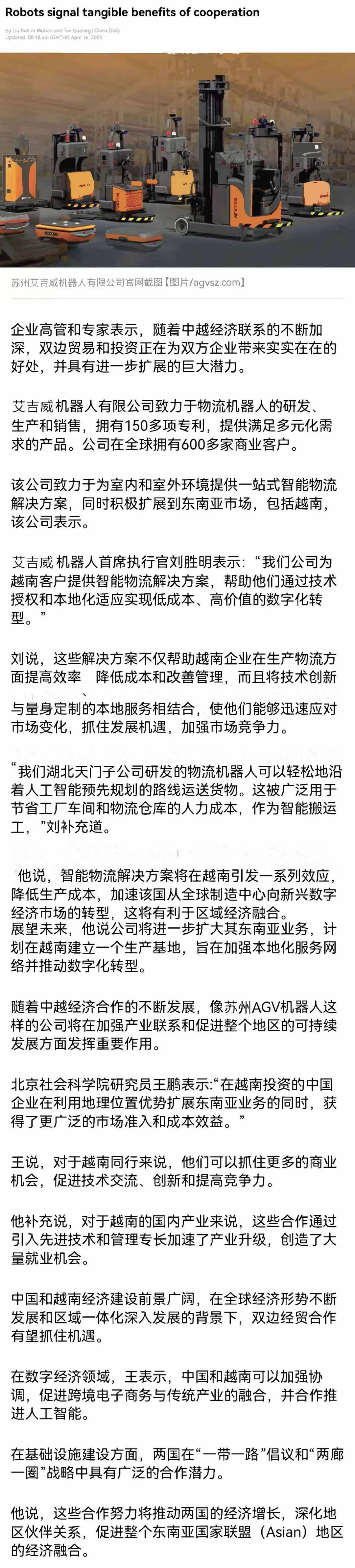 2025年4月,中国国家主席对越南的访问不仅深化了两国战略伙伴关系,更成为中越经贸合作的新里程碑。中国日报英文版在报道这一历史性事件的同时,聚焦了艾吉威机器人(AGV)出口越南的案例,彰显了中国智能装备企业在东南亚市场的技术实力与产业价值。作为中国AGV领域的佼佼者,艾吉威以自主创新技术赋能越南及东南亚制造业,助力区域产业升级与可持续发展。