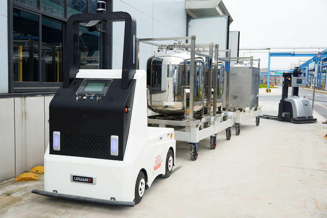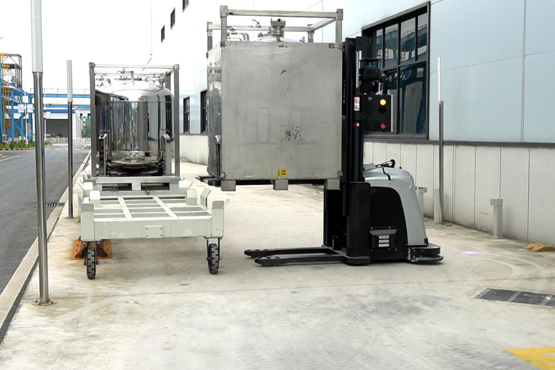 跨车间转运通过无人驾驶牵引车,单次可同时搬运4个托盘或吨桶,在不同车间仓库之间进行转运,叉车与牵引车之间实现自动装卸,自主避障和规划路线,拖车可实现自动脱钩挂钩。AGV通过云端管理平台、RCS调度系统、WMS系统,实现从排期生产、出入库管理、库存管理、过程控制、设备管理到配送物流等全流程自动搬运,实现车间物流信息化、智能化、规范化运营。