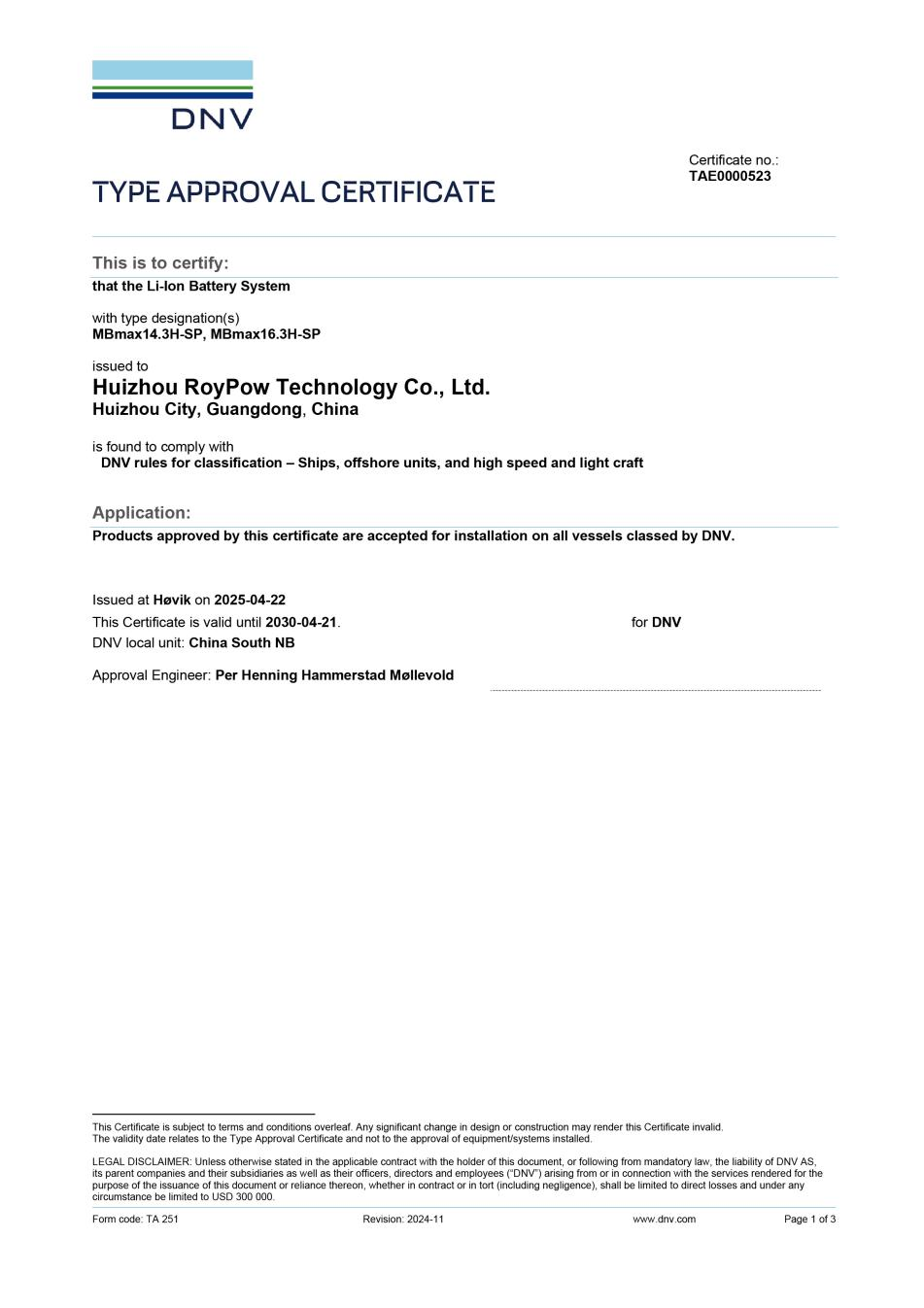 DNV挪威船级社成立于1864年,是全球领先的船级社和国际权威认证机构。DNV对乐亿通船舶动力电池系统提出了最严苛认证标准,从系统结构的设计要求、电气安全、电池安全、环境适应性、电磁兼容、功能安全、环保等方面进行全方位的技术要求审核和严格测试,并完成了整体体系和生产质量控制技术审核,最终通过并授予DNV认证证书。