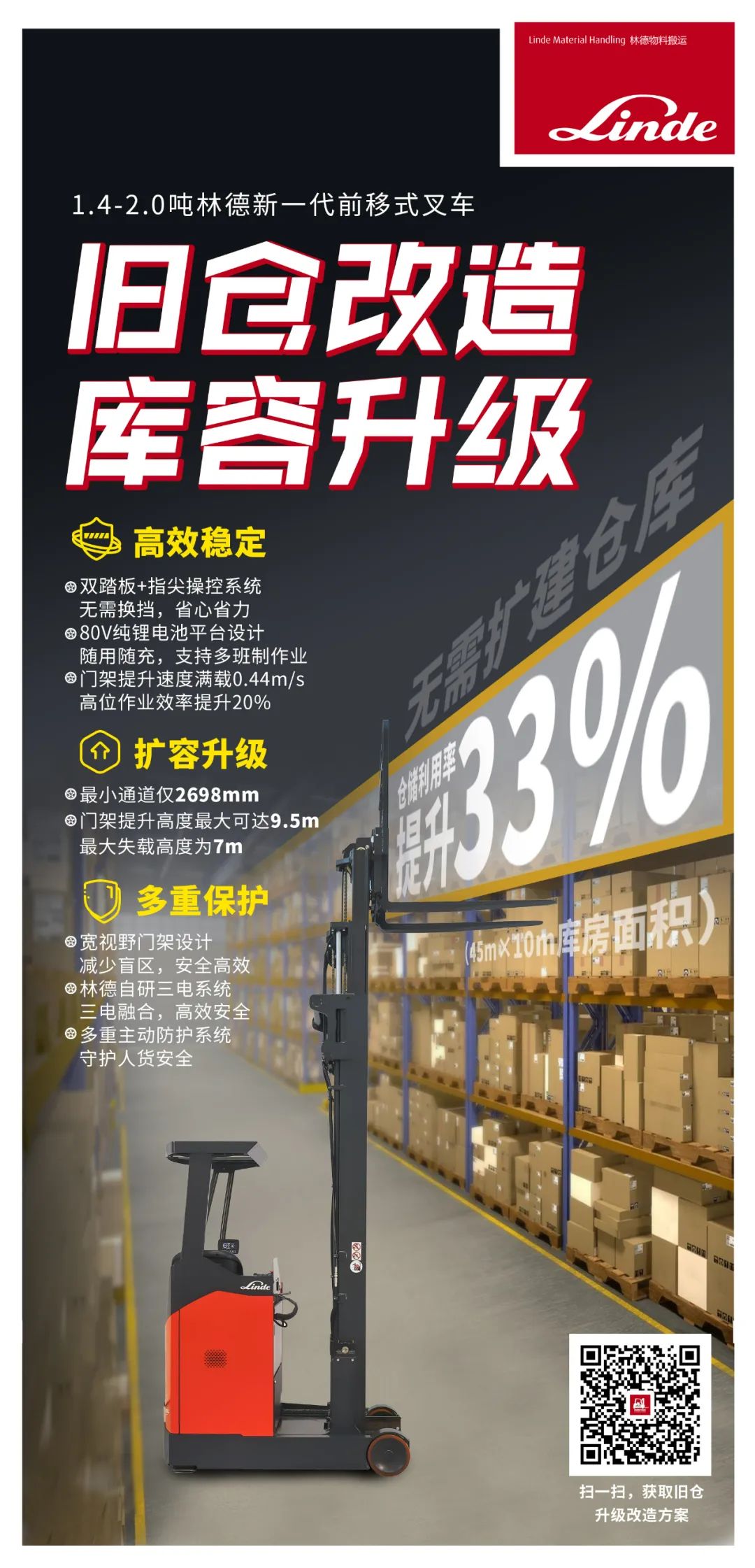 效能升级:凯傲自主研发三电系统,整车适配性强,电机电控响应迅速,时速高达11km/h。