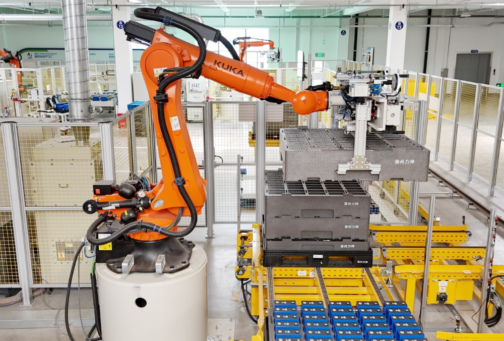 采访期间,中叉网记者还在和鼎技术人员的带领下,实地参观了公司现代化的新能源电池搬运与存储系统。记者注意到,整个搬运过程由智能物流机器人自主完成,自动从产线末端取货,再精准送达立体仓储系统内预设的货架位置。技术人员介绍:“整个系统由合力旗下兄弟公司(合力科技)设计和建造的,通过强大的数字孪生技术,实现对电池状态、存储位置、库存情况的全面数字化管控,极大提高了生产效率与存储安全性。”