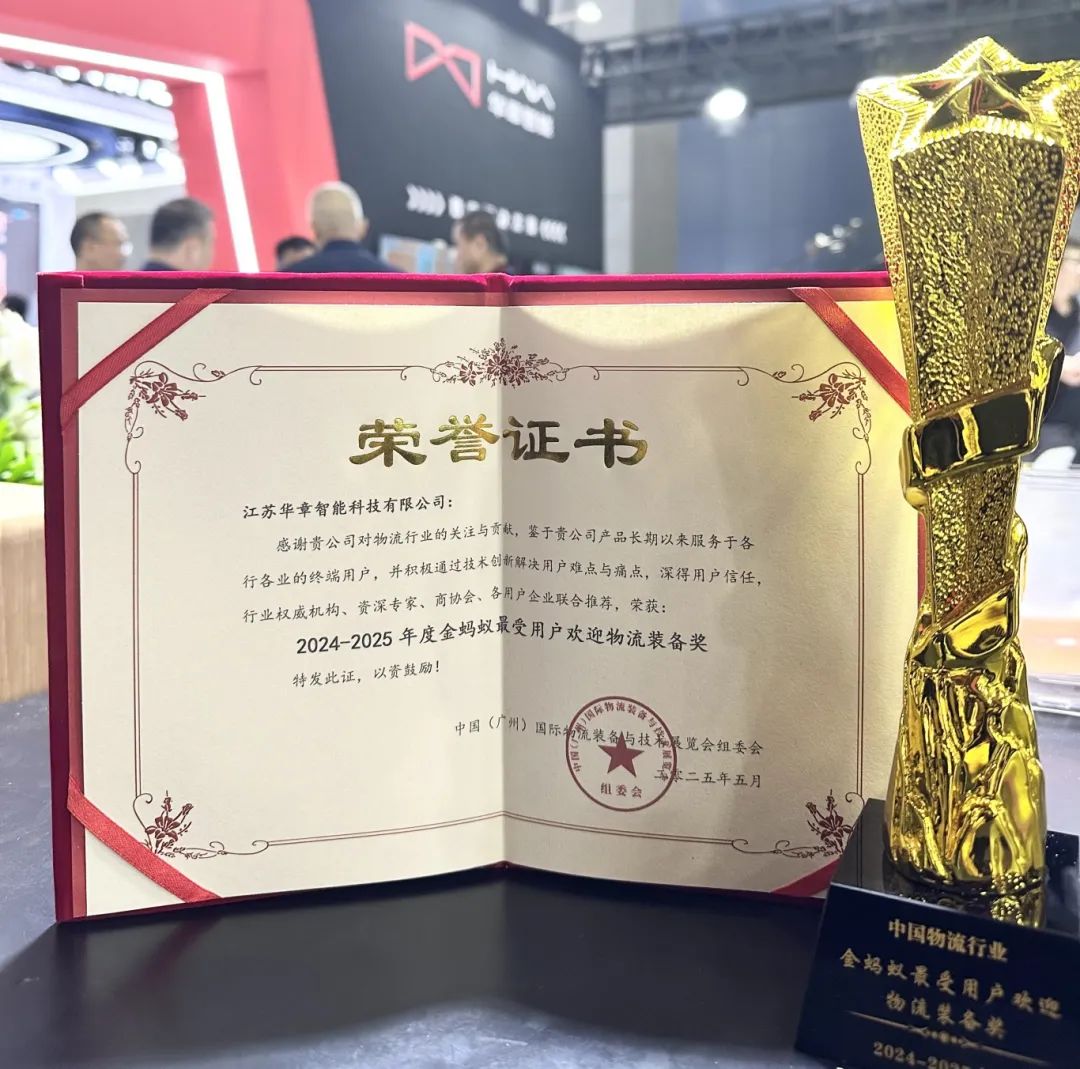 凭借卓越的产品性能和良好的市场口碑,华章智能荣获了"2024-2025年度金蚂蚁最受用户欢迎物流装备奖"。
