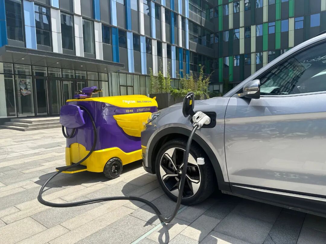 在国家新能源汽车技术创新中心,工作人员驾着紫黄色相间的机器人“阿O”赶来,停到了一台新能源汽车前,随后打开充电盖板,直接将充电枪接入汽车。