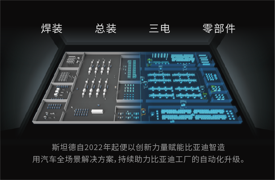 目前,斯坦德汽车全场景智能智造解决方案已服务比亚迪、丰田、蔚来、小米等多家汽车行业头部企业,其兼具高效性、经济性与扩展性的技术特质,通过标准机器人平台与功能性机器人的规模化应用,显著提升了汽车整厂自动化率。