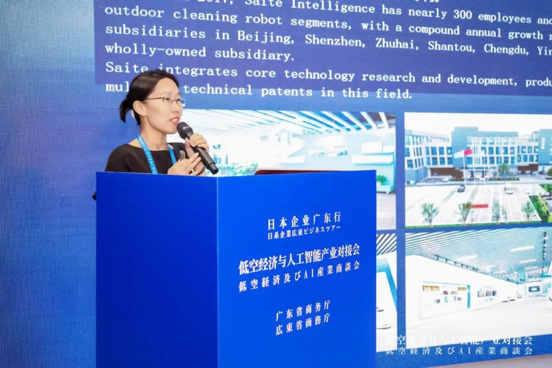 在低空经济与人工智能产业对接会企业分享环节,赛特智能海外事业部负责人蒋美玲以“具身智能机器人全场景应用”为题进行发言: