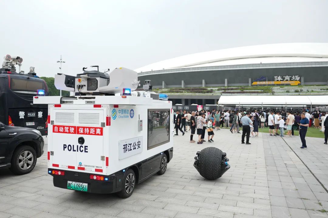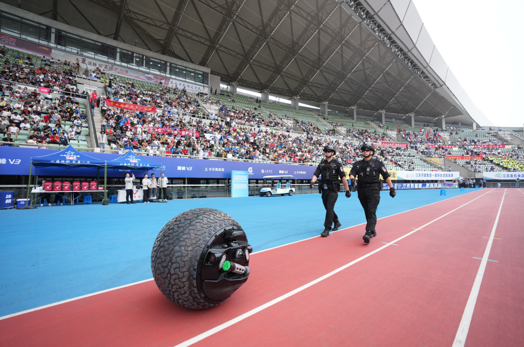 6月14日在扬州体育公园体育场“苏超”第4轮比赛赛场上扬州公安在赛事安保中部署了水陆两栖球形机器人这是该款装备首次应用于省内大型活动安保实战机器人直径为80公分重量约190公斤具备L4级别自主巡...