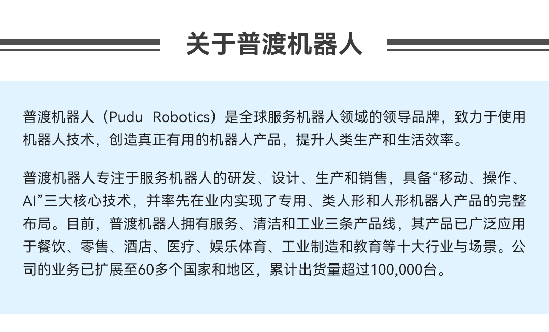 普渡科技成立于2016年,总部位于硬件创新之都深圳,是一家集机器人研发、制造和销售为一体的行业领先的智能配送机器人及低速无人驾驶解决方案商。公司目前有员工百余名,包括深圳总部及成都分公司,研发占比超过50%,从创立至今,普渡一直坚守“发明家精神”,始终践行企业文化,以用户为中心,展现机器人带给人类生产生活的无限可能。