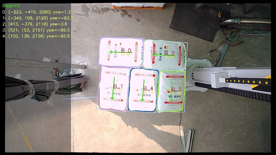 自研RGB-D融合相机,实现毫米级定位精度,面对强光照射、阴影干扰、纹理反光/阴暗/复杂,以及表面变形等软包仍可稳定成像,适应软包形变、麻袋不规则表面等复杂场景。