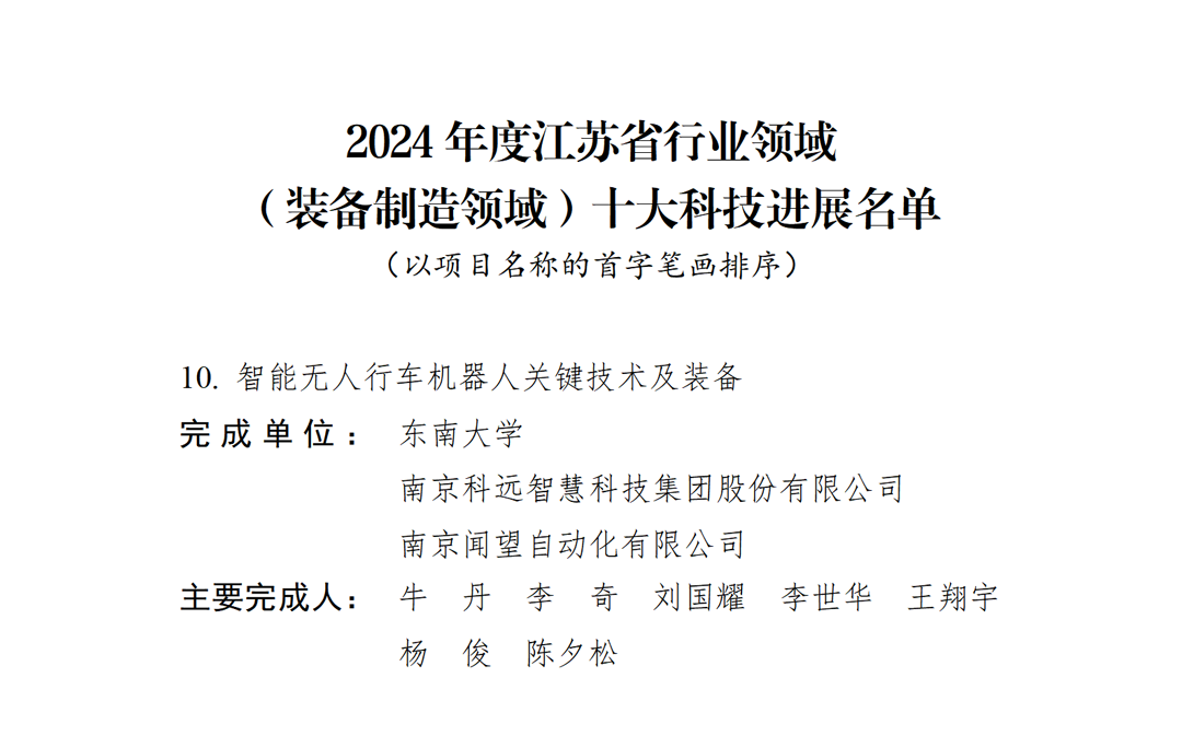 近期,江苏省科学技术协会公布2024年度江苏省行业领域十大科技进展。科远智慧联合东南大学、科远子公司南京闻望自动化完成的“智能无人行车机器人关键技术及装备”技术成果成功入选2024年度江苏省行业领域(装备制造领域)十大科技进展。
