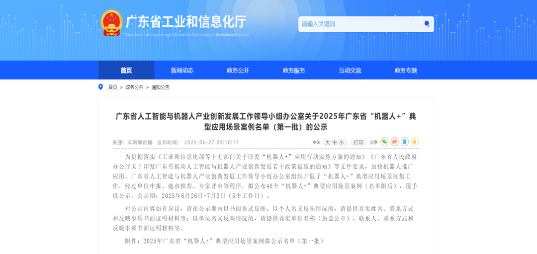 2025年6月,广东省为贯彻落实《工业和信息化部等十七部门关于印发“机器人+”应用行动实施方案的通知》《广东省人民政府办公厅关于印发广东省推动人工智能与机器人产业创新发展若干政策措施的通知》等文件要求,加快机器人推广应用,广东省人工智能与机器人产业创新发展工作领导小组办公室组织开展了“机器人+”典型应用场景征集工作,经过单位申报、地市推荐、专家评审等程序,劢微机器人入选2025年广东省“机器人+”典型应用场景案例(第一批)名单,全省申报项目中仅有48个“机器人+”优秀案例入选。