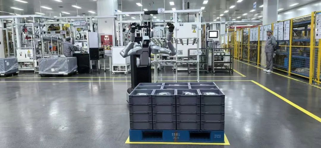 通过双臂协作与高精度操作,A2-W可抓取、搬运、放置不同尺寸与重量的周转箱,并且在托盘料箱码放不规范时,它还可自主识别并调整姿态抓取,在作业过程中出现异常时,也能自主纠错并持续运行,显著提升整体作业效率。