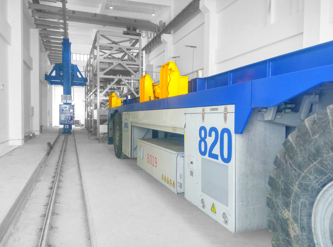 回溯换电系统的研发过程,首先摆在项目团队面前的是电池包的搬运问题。AGV电池重量超过5吨,堪比一头成年大象。常见的使用叉车搬运模式在狭长的换电站内有极大的安全隐患,也制约多车换电效率。项目团队聚在一起研究规划图,头脑风暴几个小时后,有人提出换电站本质上就像是一座“装着海量插座的大仓库”,电池包就是插在货架上充电的货物。顺着这个思路,团队找到常运用于高密度立体仓库的一种智能搬运设备——双门柱形堆垛机,这一设备就像个灵活的“大力士”:身材苗条不占地方,能沿着轨道快速横移,货叉升降速度快,承载能力强,非常适合在换电站这种标准化的“工作间”里高效干活。
