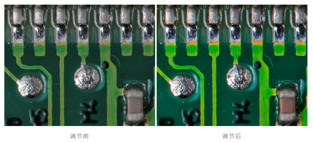 支持CCM调节算法,搭配色调和饱和度参数调节应用,可以满足SMT等行业严格的图像检测需求。