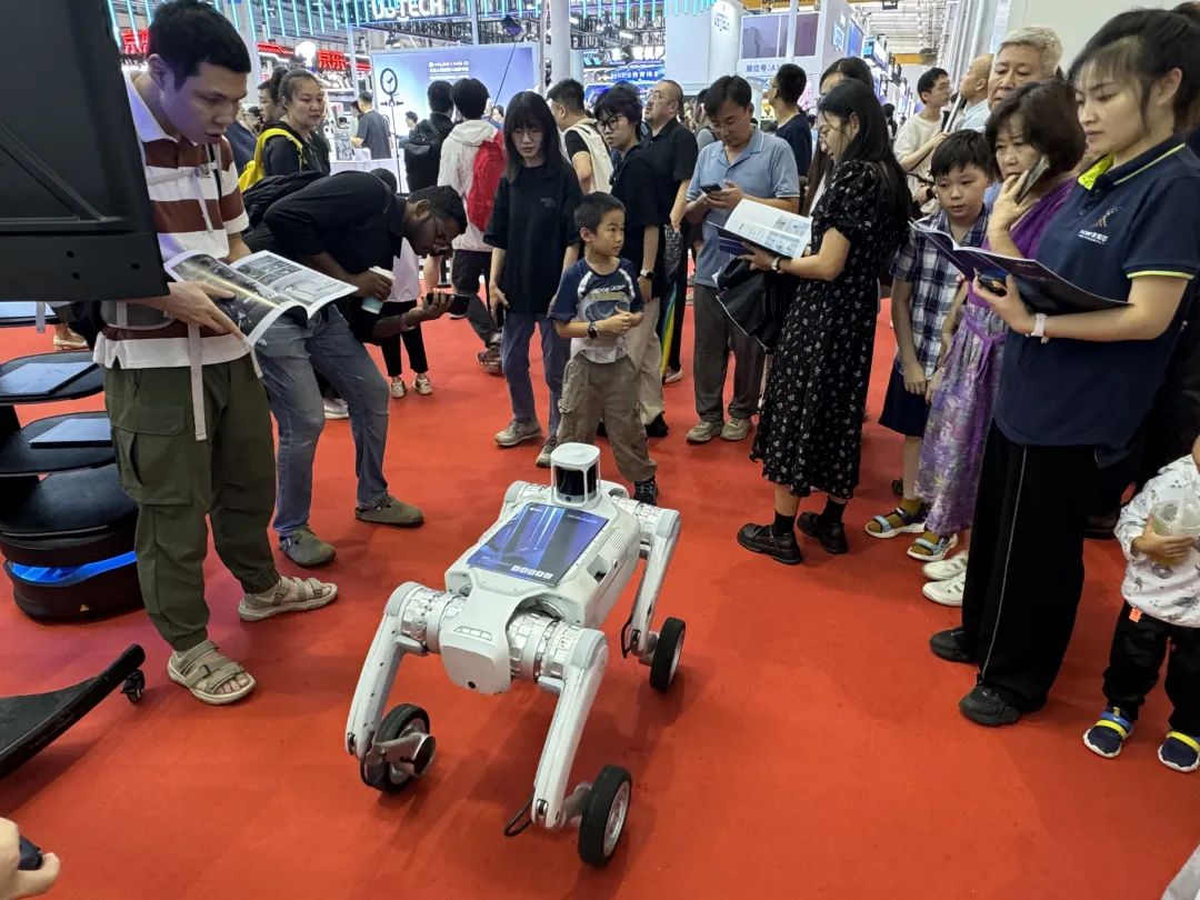 在本届WRC上,“PUDU D5-W”也迎来了线下首秀。D5-W机器狗具备超强运动性能,可轻松适应砂石、陡坡、台阶等复杂地形,并集成AI多模态交互、自主导航避障与多形态协作能力。展会现场,D5-W机器狗在人群中灵活穿梭,并为观众提供智能引导服务,其卓越的运动性能和协作潜力给观众留下了深刻印象。