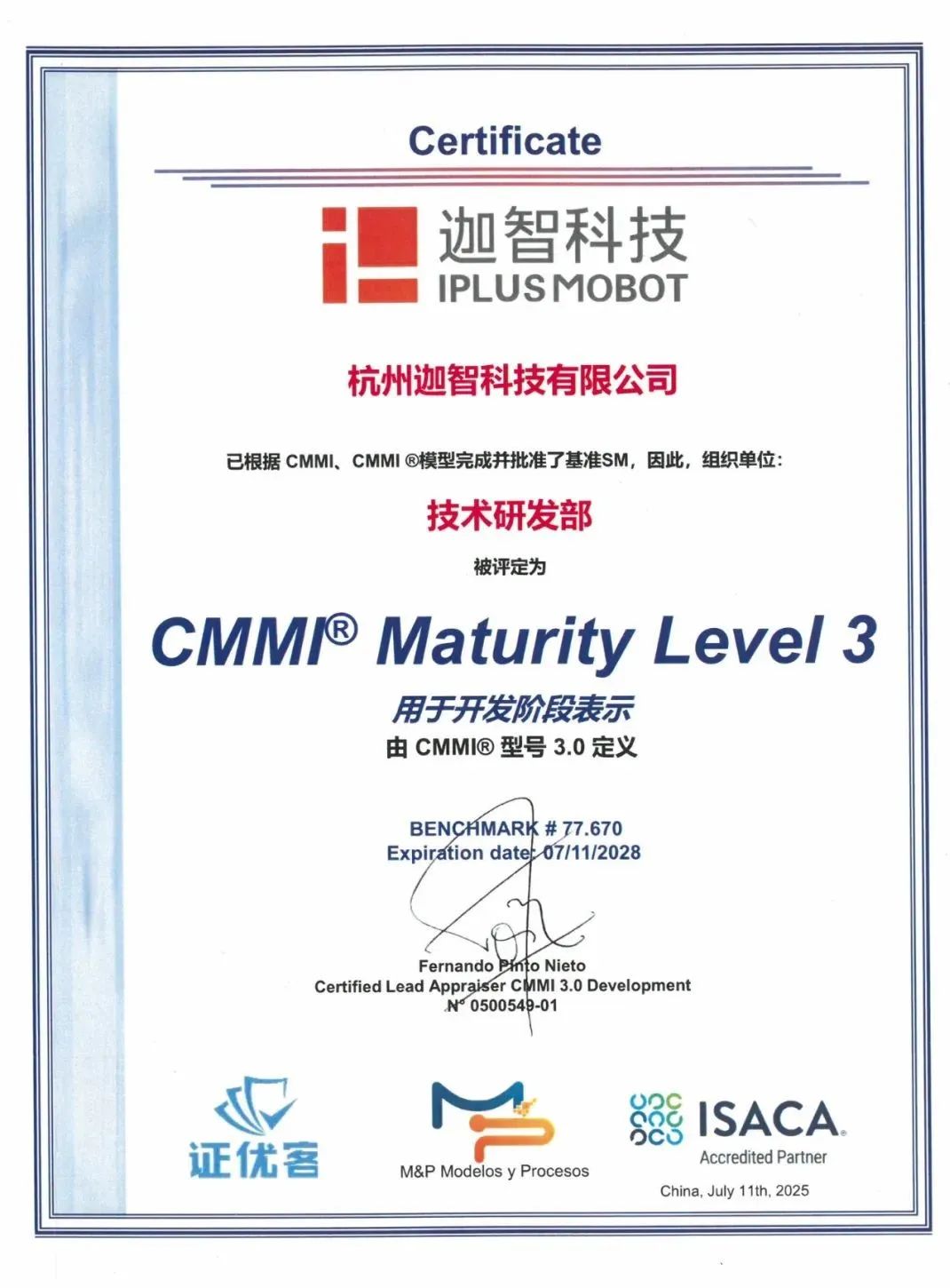 2025年8月,迦智科技研发部门正式通过ISACA的能力成熟度模型集成(CMMI®)3级评估,这标志着公司在软件研发、过程组织、项目管理等方面已达到国际权威标准。