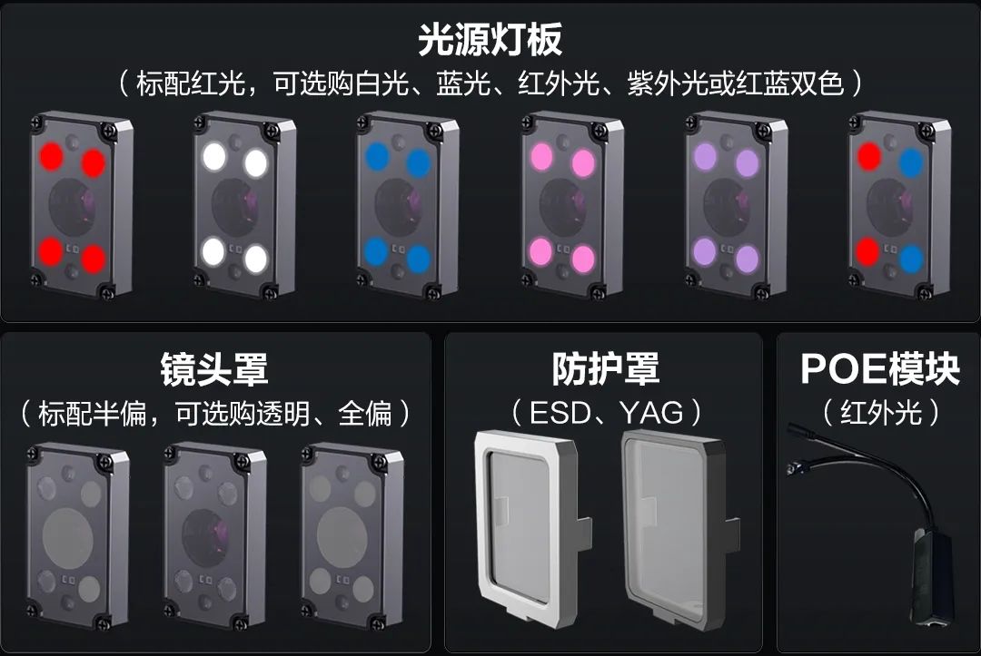 采用模块化架构,不仅支持光源、镜头、镜头罩等配件选配,还提供ESD、YAG专业防护罩,轻松应对不同工作场景。同时支持POE供电(限红外灯板),部署更灵活,全面增强场景适应力。