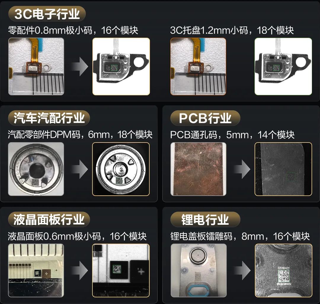 ID2023XM凭借超强AI算法,精准应对3C电子、PCB、汽配、锂电等多行业复杂读码挑战,为高精度、高效率生产注入新动力。