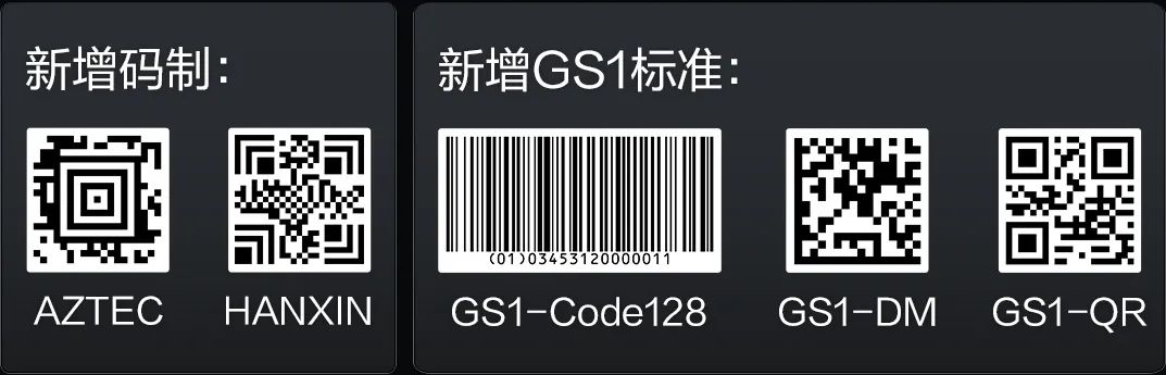 ID2023XM支持码制进一步丰富,新增对AZTEC、HANXIN、GS1等多种码制的支持。