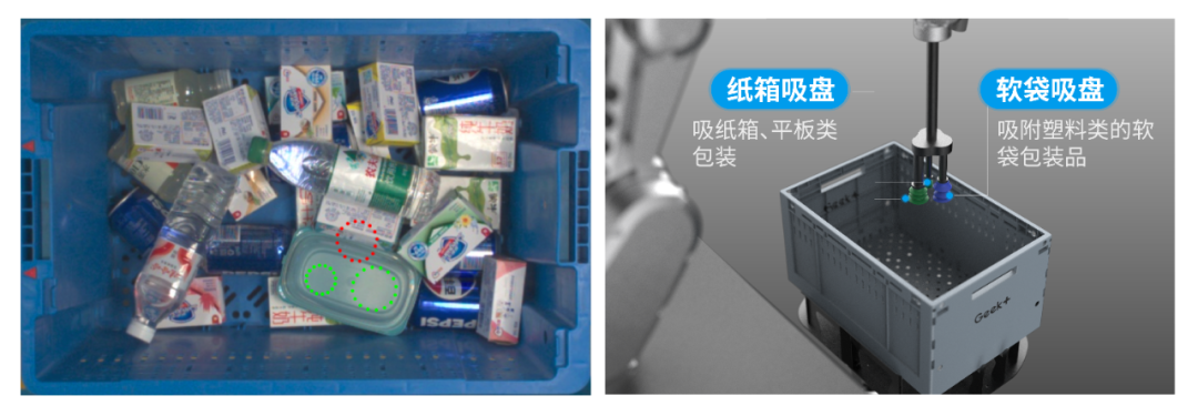 极智嘉的首个通用机械臂操作技术方案,专为解决这一难题而来。它通过多目相机捕捉高精度 3D 环境信息,结合系统订单信息,通过 Geek+ Brain 模型完成智能拣选工作:精准分割物品并识别材质特征,推理生成完整 3D 信息和空间定位,进而判断最优抓取点,智能决策末端执行器的吸盘选择和机械臂运动轨迹,稳稳完成智能摆放。