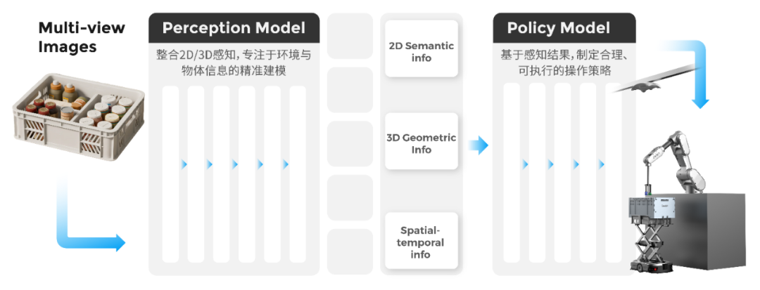 极智嘉的具身智能基座模型 Geek+ Brain 采用 “感知-策略”两段式分层架构,由 Perception Model(感知模型) 与 Policy Model(策略模型) 两个核心层组成。
