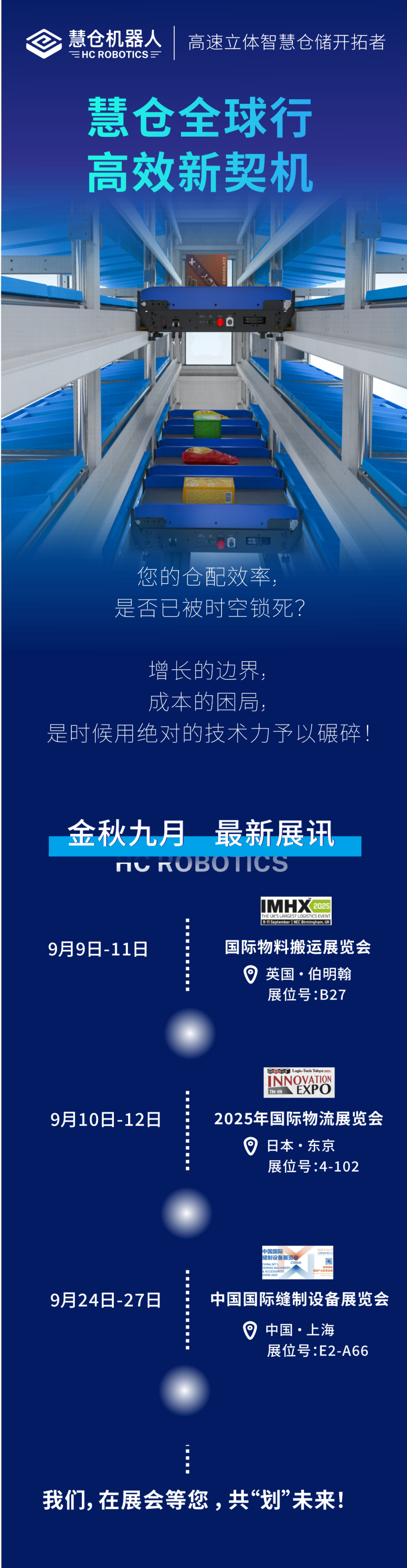 金秋九月,慧仓机器人蓄力启航,接连亮相海内外三大行业顶级盛会。我们旨在与世界前沿的智慧物流思潮同频共振,展示“省人省地,双管齐下”的物流自动化解决方案。从东亚到欧洲,慧仓将与您共同探索降本增效的无限可能,见证物流自动化的未来已来。敬请期待我们的展会征程!