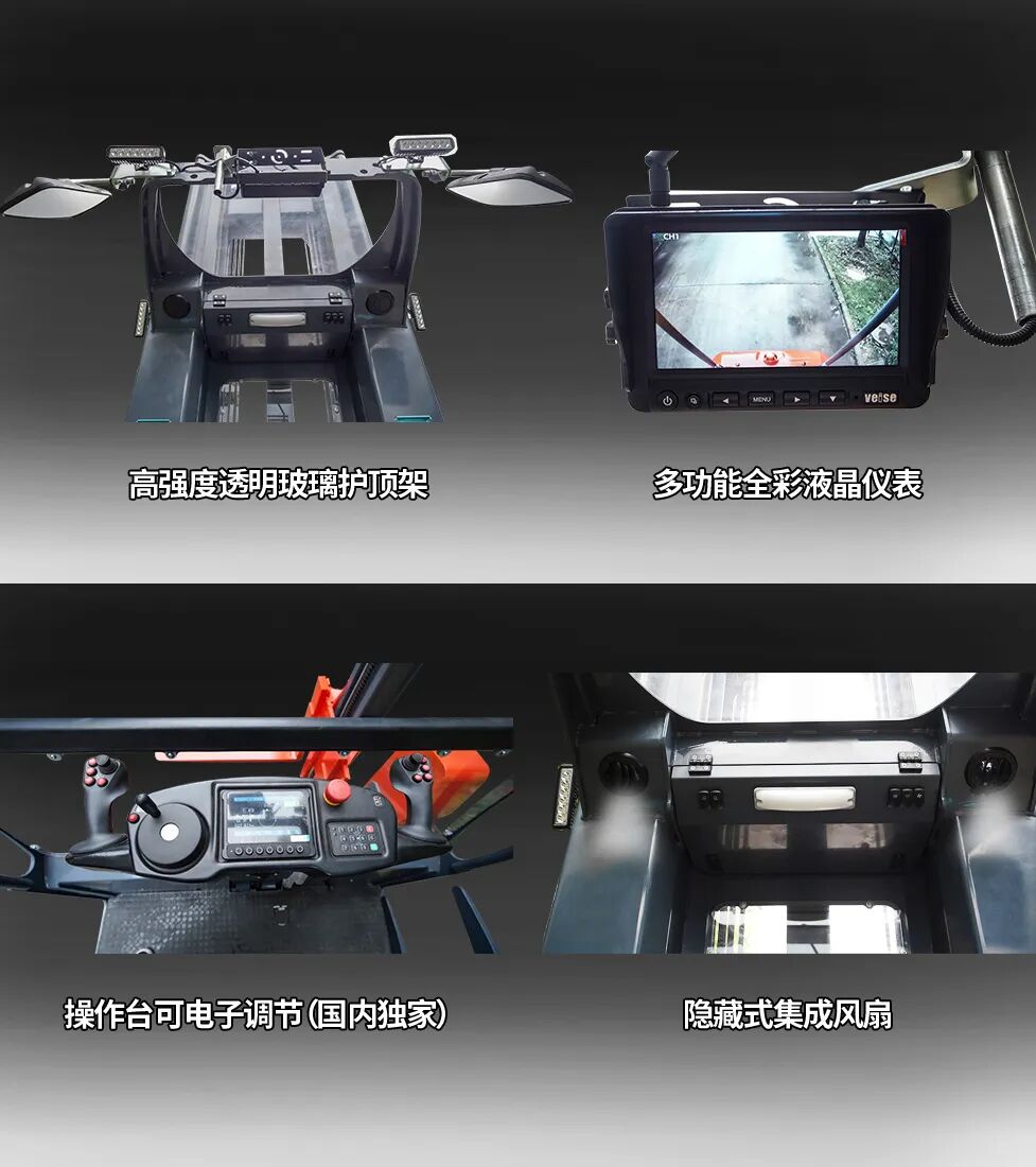 配备高强度透明玻璃护顶架,在确保操作安全的同时提供开阔清晰的视野。隐藏式集成风扇设计有效提升空间利用率,整体造型简洁美观。操作台采用行业首创的可电子调节方式(国内独家),搭配升降折叠座椅,可快速切换站驾与座驾模式,灵活适应拣选、堆垛等多种作业需求。多功能全彩液晶仪表实时动态显示车辆信息,帮助操作者精准掌握设备状态,显著提升人机交互体验与作业效率。