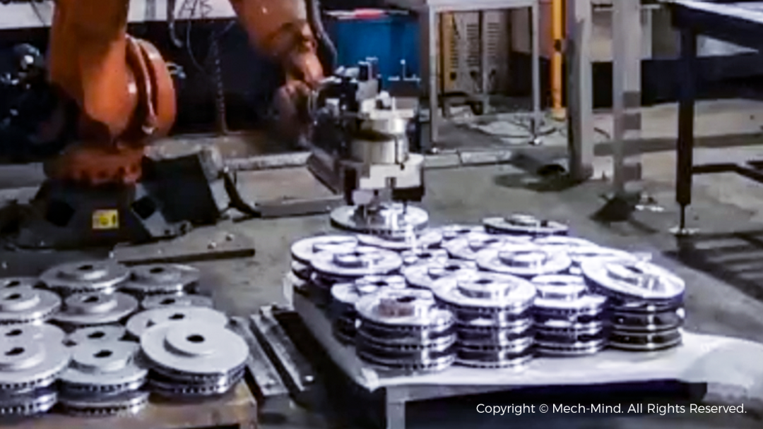 Mech-Eye LSR L具备优异的抗反光及抗环境光性能,可在强光干扰下对带有油污的反光刹车盘高质量成像。基于自研AI识别及规划技术,机器人可准确识别每个工件,智能规划抓取顺序,有效解决紧密堆叠和遮挡问题。