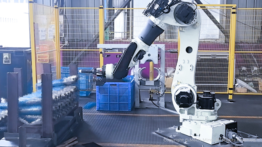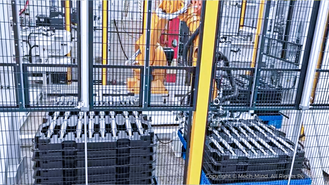 花键轴是汽车传动系统的重要精密零部件,传统生产方式效率低,且极易发生碰撞、剐蹭等问题,严重影响成品质量。梅卡曼德自研抗反光等AI技术可应对工件反光、塑料包膜以及环境光等干扰,助力机器人准确、稳定完成精密零部件上料、码筐等任务,提升产线自动化水平,提高生产效率。