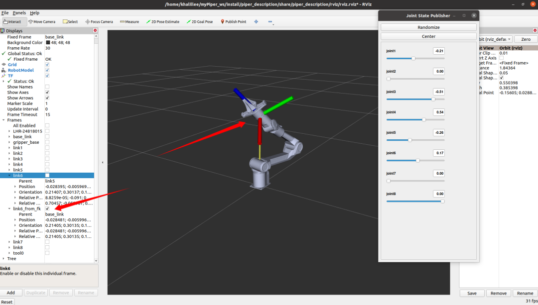 1. 2. 启动RVIZ仿真程序,开启显示TF树,观察计算的FK所得的机械臂末端link6_from_fk的姿态是否和机器人原本的link6(由joint_state_publisher计算)是否重合