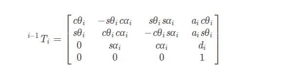 T << cos(theta), -sin(theta)*cos(alpha),  sin(theta)*sin(alpha), a*cos(theta),sin(theta),  cos(theta)*cos(alpha), -cos(theta)*sin(alpha), a*sin(theta),0,           sin(alpha),             cos(alpha),            d,0,           0,                      0,                     1;