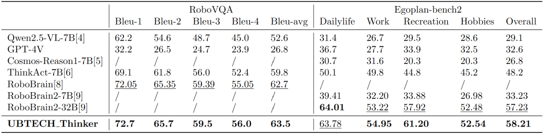 优必选Thinker在RoboVQA与Egoplan-bench2中排名第一