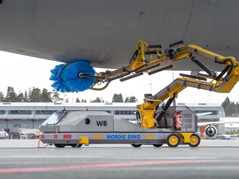 在效率与资源利用方面,Nordic Dino 提供了“湿洗”和“干洗”两种模式。以窄体飞机为例,湿洗时需消耗约 200 至 250 升混合清洁液,以及 500 至 1000 升清水,而干洗则仅需约 45 升水和少量清洁剂即可完成作业。两种方式结合使用,不仅节省资源,还能兼顾日常维护与深度清洁效果。实践证明,定期保持机体外部清洁不仅有助于改善外观,还能降低空气阻力,提升燃油效率,从而带来长期的经济效益。