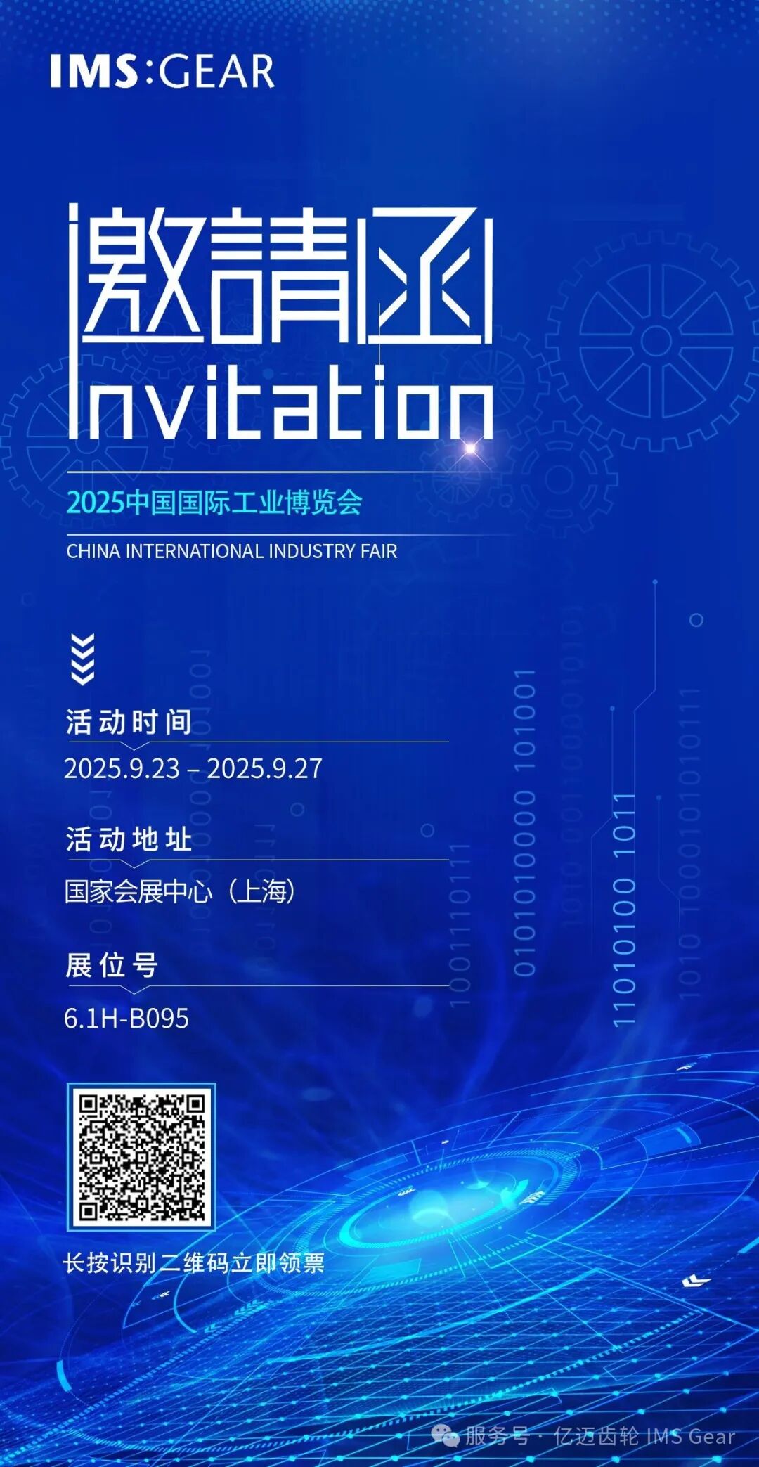 2025中国国际工业博览会将于9月23日至9月27日在上海国家会展中心隆重举行。亿迈齿轮(太仓)有限公司将携模块化标准行星齿轮箱技术方案亮相本次展会。我们诚邀您的到来,扫描下方二维码注册即可免费入场参观。