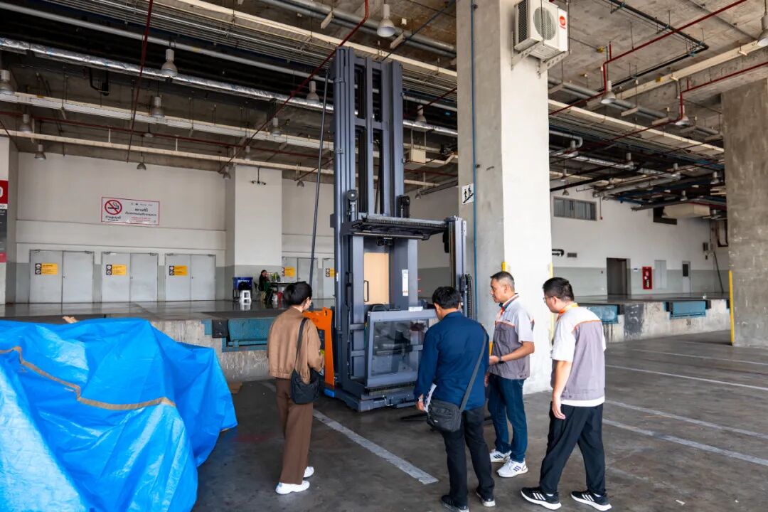 其中,最大起升高度18m的人上型三向叉车备受瞩目,它具备出色的高空载荷能力与高效的行驶速度,可以说是有着高空堆垛+高位拣选双重需求企业的不二之选。卓一海外销售团队热情地接待每一位客户,并邀请大家移步室外演示区,观看人上型三向叉车的实际操作效果。