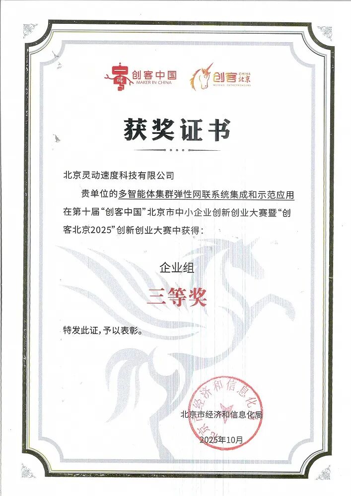 近日,ForwardX Robotics(灵动科技) 凭借自主研发的“多智能体集群弹性网联系统集成与示范应用”项目,在第十届“创客中国”北京市中小企业创新创业大赛中脱颖而出,荣获企业组三等奖!
