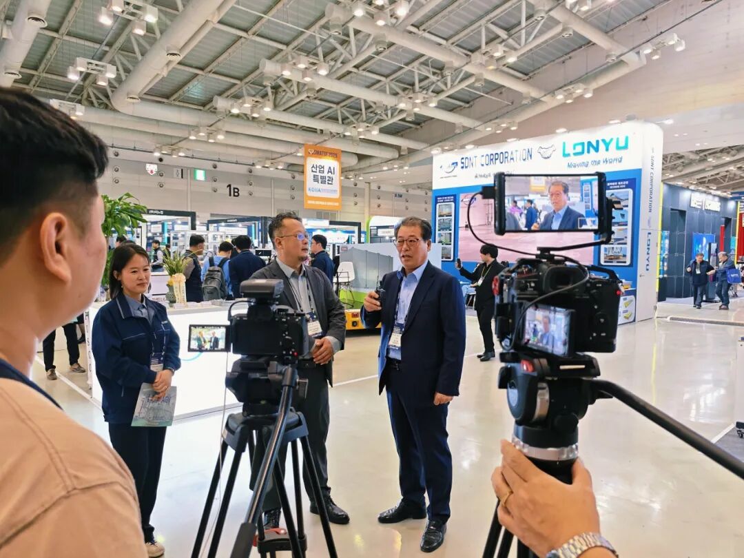 展位内全程只展示朗誉机器人的核心产品,不掺杂任何其他品牌展品,用纯粹的产品实力说话。这一举措不仅体现了 SDNT 对朗誉产品的十足信心,更彰显了两家企业深度绑定、紧密协作的合作理念。展会期间,朗誉机器人与 SDNT 的两位董事长亲临展位,共同接待来访客户、探讨市场布局,用高层对话的诚意与决心,为双方长远合作注入了强劲动力。在展会中,两位董事长接受了韩国当地多家媒体的采访。采访中,两位董事长围绕中韩企业合作模式、朗誉产品技术优势、韩国市场战略布局等话题展开分享,向外界传递了双方深耕智能制造领域、共赢海外市场的坚定决心,