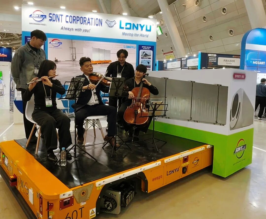 展会现场最吸睛的环节,莫过于朗誉机器人打造的 “移动舞台”—— 在平稳行驶的 AGV 上,一支乐队现场演奏,悠扬旋律与 AGV 的精准移动完美融合,成为全场焦点。