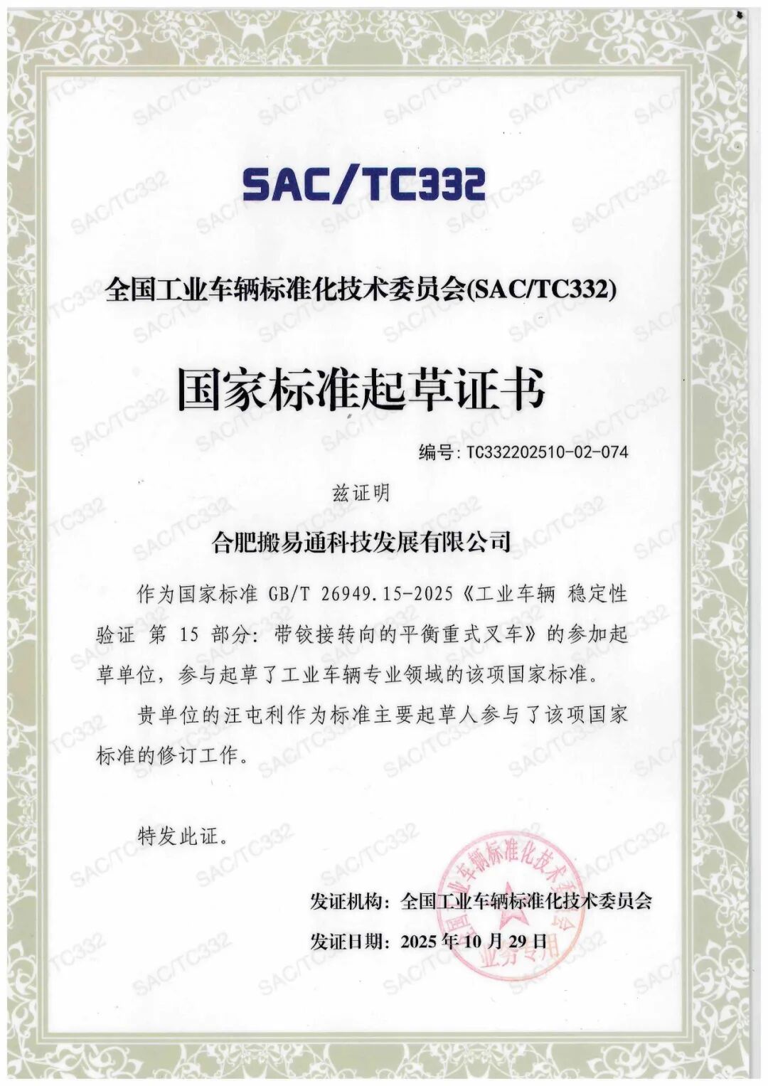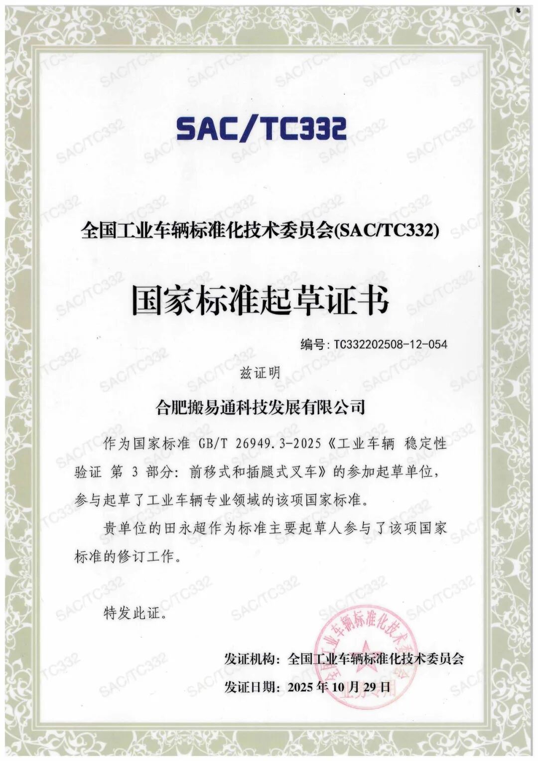 参与国家标准证书起草是企业技术实力的体现,更是对行业安全发展的责任担当。合肥搬易通已参与起草9项国家标准,拥有超过340项国家技术专利,其中多项核心专利集中于超窄通道叉车领域。