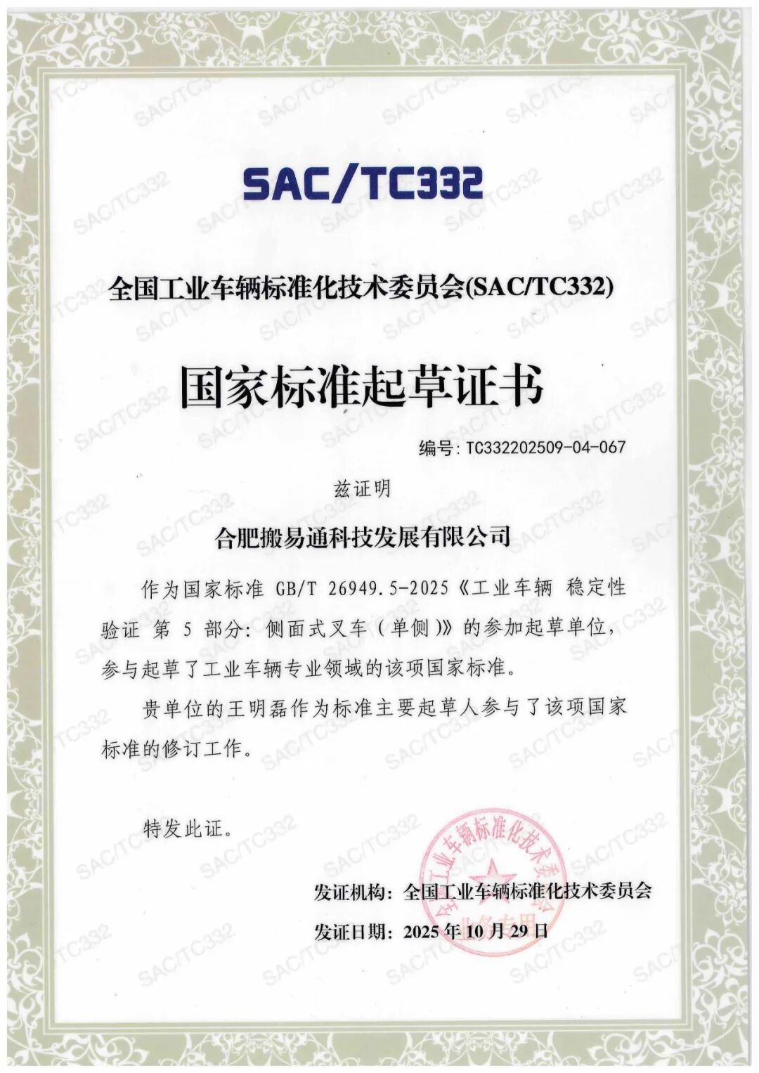 近日,合肥搬易通科技发展有限公司(MiMA)作为国家级专精特新“小巨人”企业,凭借其在工业车辆领域的技术积累,深度参与了国家标准起草工作,收到由全国工业车辆标准化技术委员会颁发的四项国家标准起草证书,为推动行业标准化、规范化和安全发展贡献了重要力量。