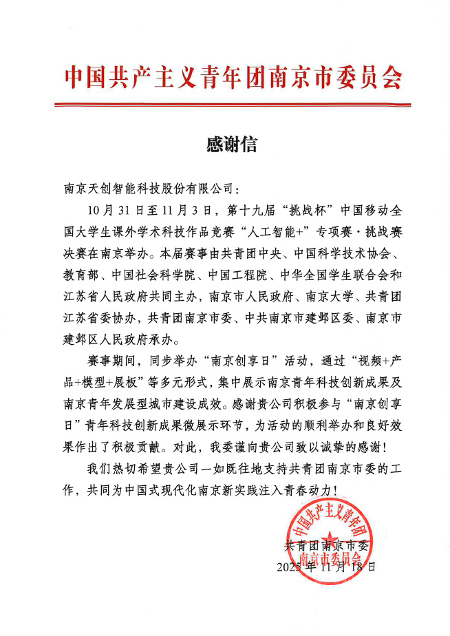 480余所高校、超10000名大学生及科技工作者参加。天创机器人以人员协助、展品演示、团体研学接待等形式,积极承接与大赛同步的“南京创享日”等多元形式环节。近日,南京团市委发来感谢信,对公司在本次大赛配套活动中的参与给予“好评”!
